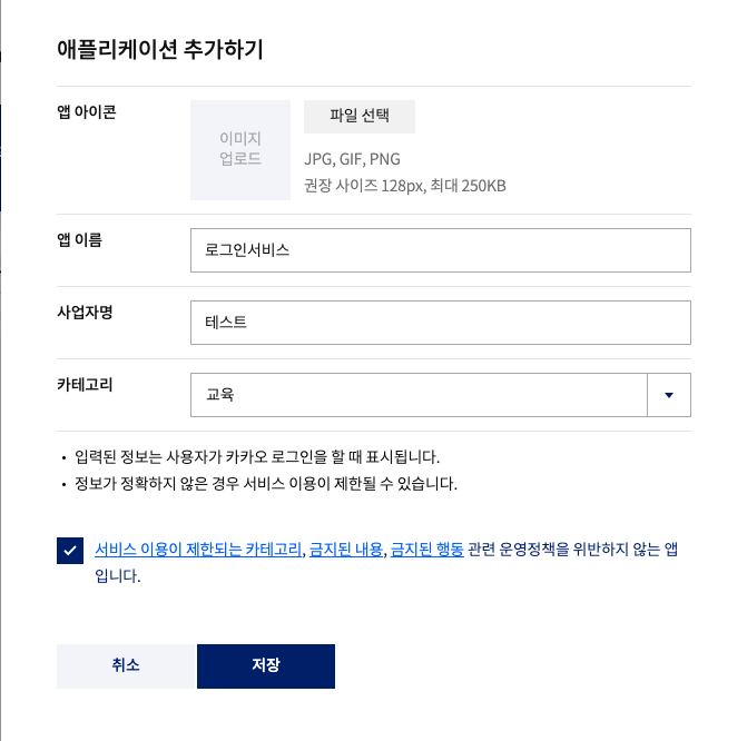 2. 앱 이름, 사업자명, 카데고리를 선택 후 체크 항목을 체크 후 저장버튼을 클릭한다.