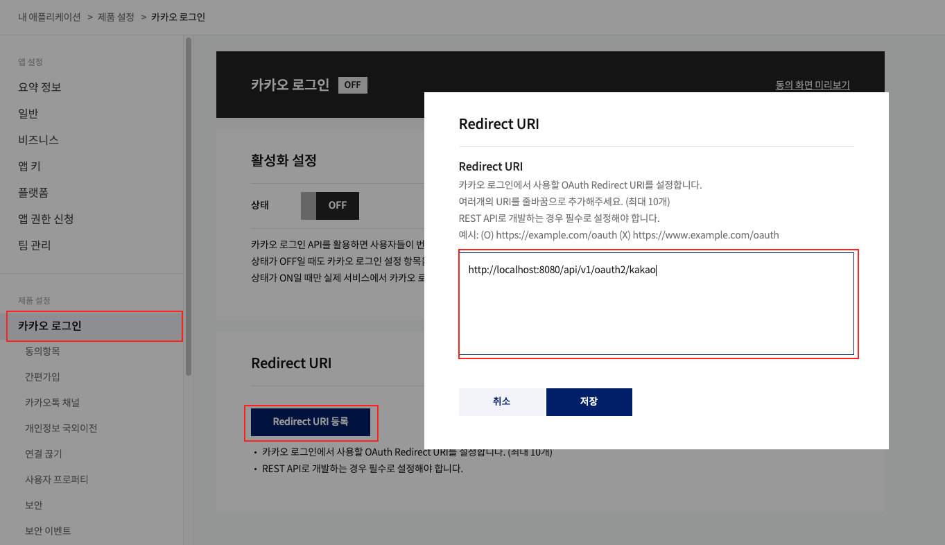 7. Redirect URI 을 추가하는 이유는 API를 호출했을 때 카카오 로그인 화면이 나타나게 하기 위해서 URI 을 지정한다.
