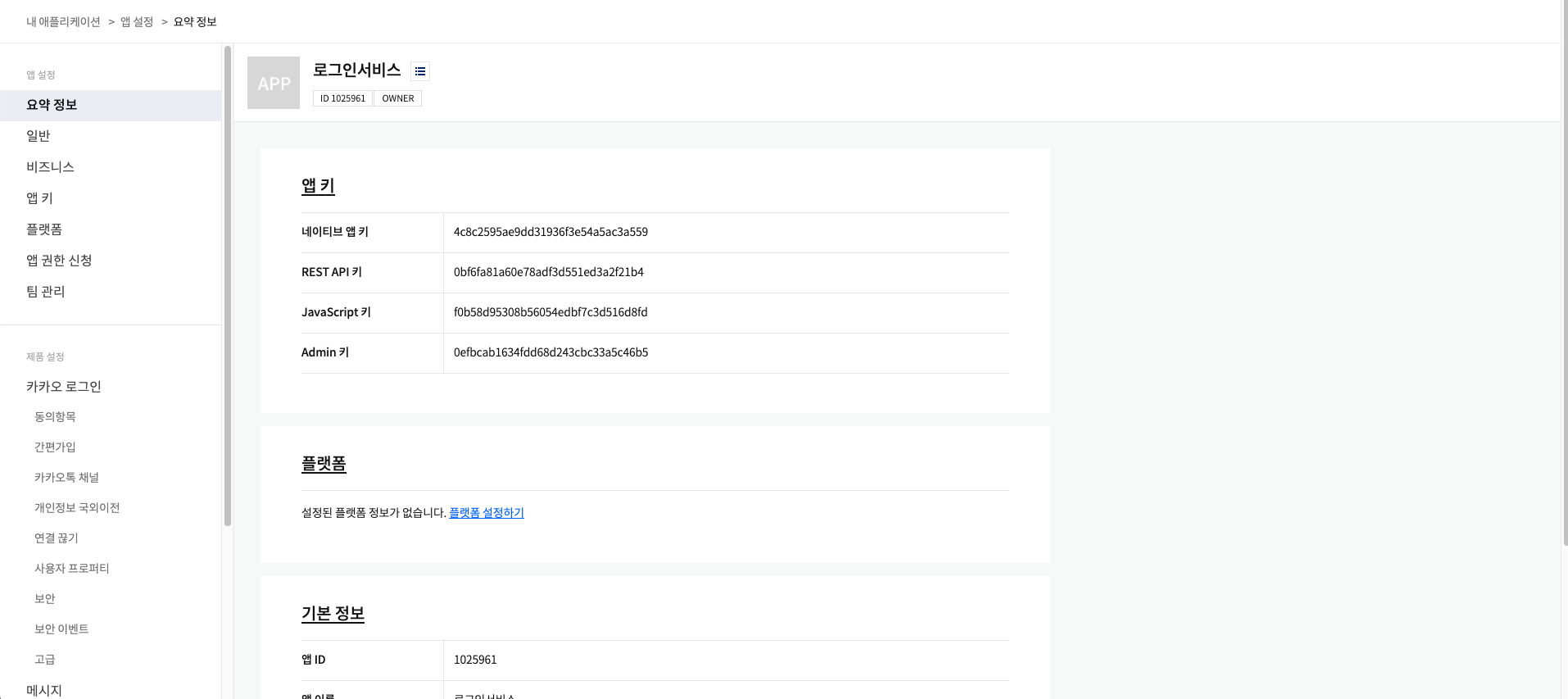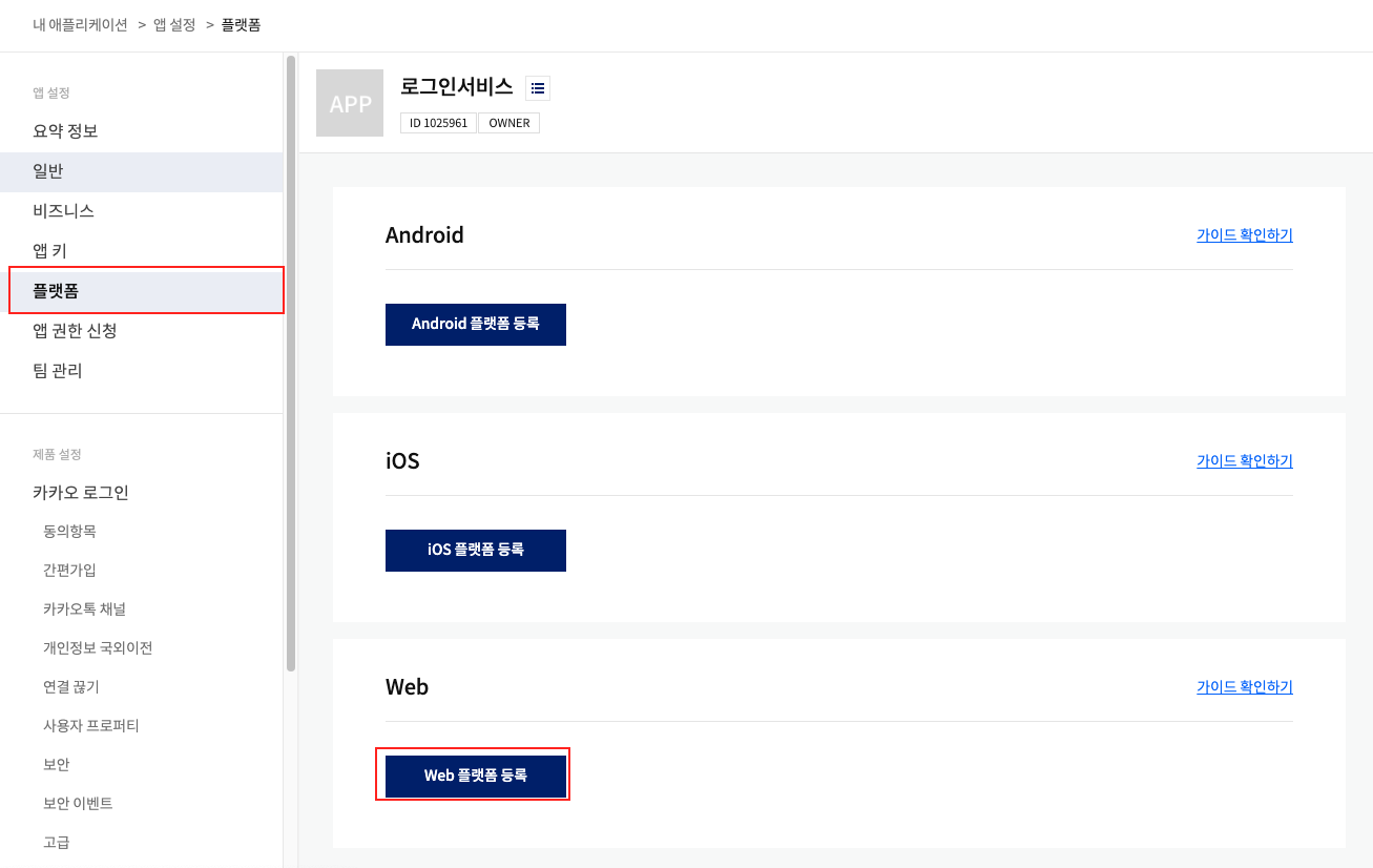 4. 왼쪽 메뉴에서 플랫폼을 선택 후 아래의 Web 이라고 표시된 부분에서 [ Web 플랫폼 등록 ] 버튼을 클릭한다.