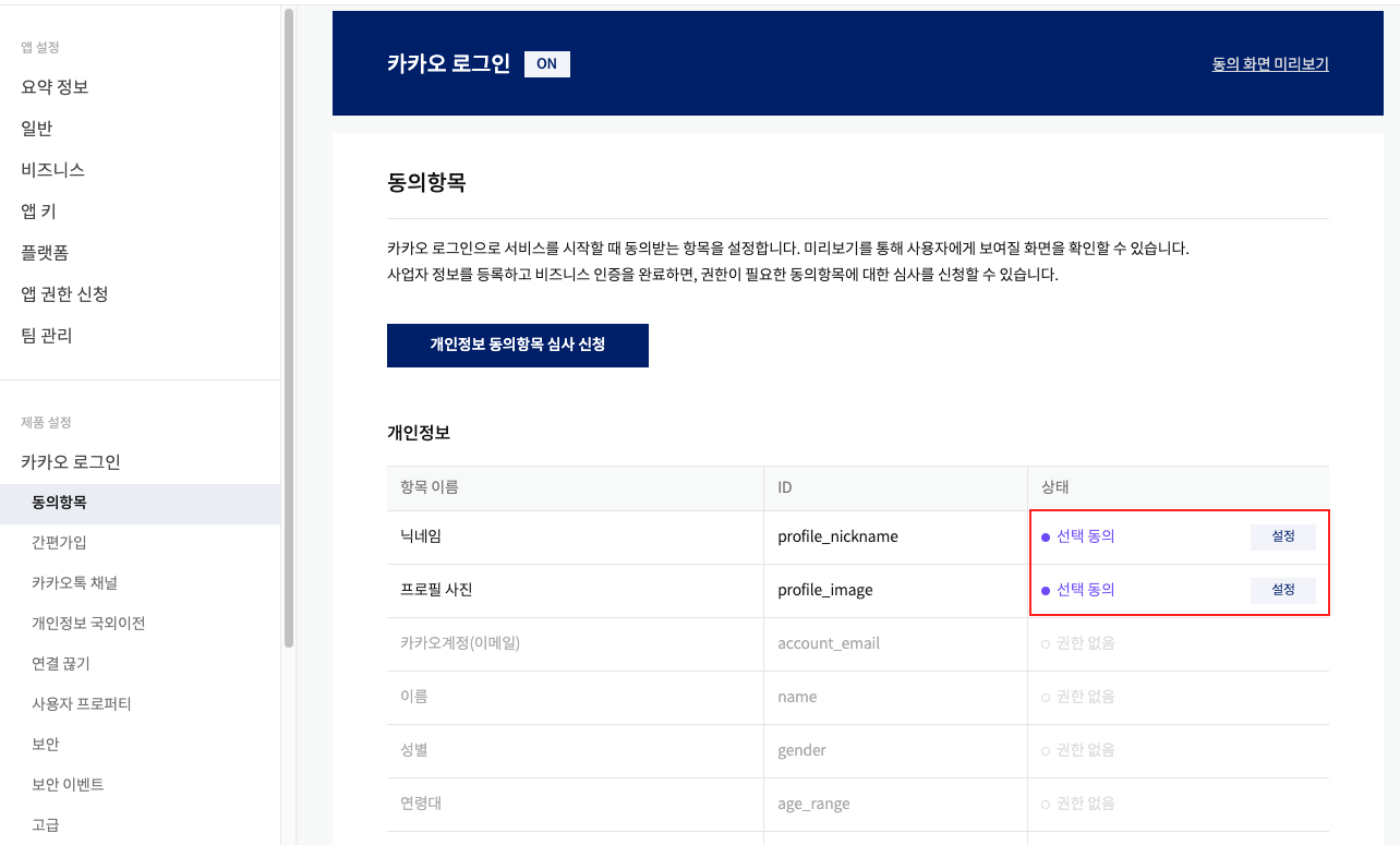 11. 카카오 로그인 후 사용자의 정보를 가져오기 위해서는 왼쪽 메뉴의 카카오 로그인 > 동의항목 메뉴를 선택 후 필요한 부분을 설정하면 된다. 나열된 항목 중 카카오계정(이메일) 등 필요한 부분이 있는 경우 개인정보 동의항목 심사 신청을 추가로 진행하면 된다.