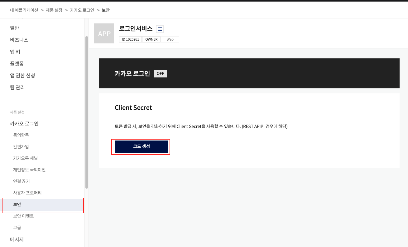 9. 왼쪽 메뉴의 보안 메뉴를 클릭 후 [ 코드 생성 ] 버튼을 클릭한다.